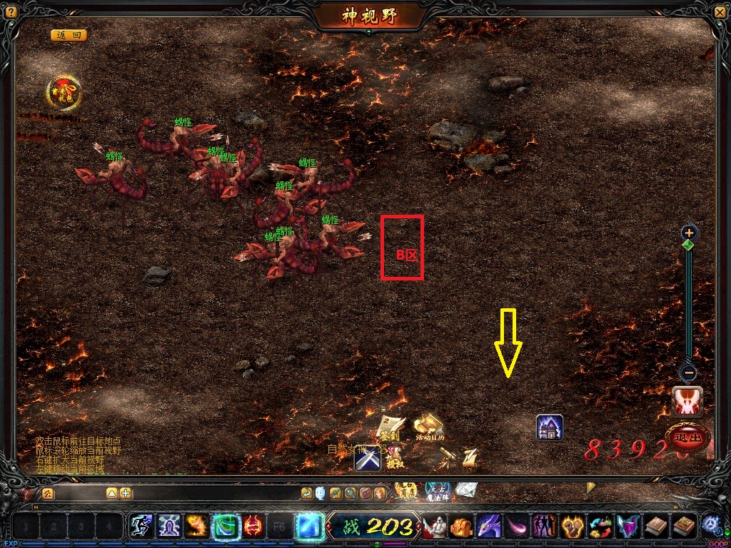 B线刷完了,马上可以按4,又回到A线,A区的蝎怪都能打完,炎女A点也能打完,炎女B点估计就打不到了,传奇sf新开xp时间那点,动物慢的,估计就只能刷完蝎怪。我朋友就牛些,他能再刷完A线的然后再过去B线再打一次,当然,我们就按最少的算吧。20个。